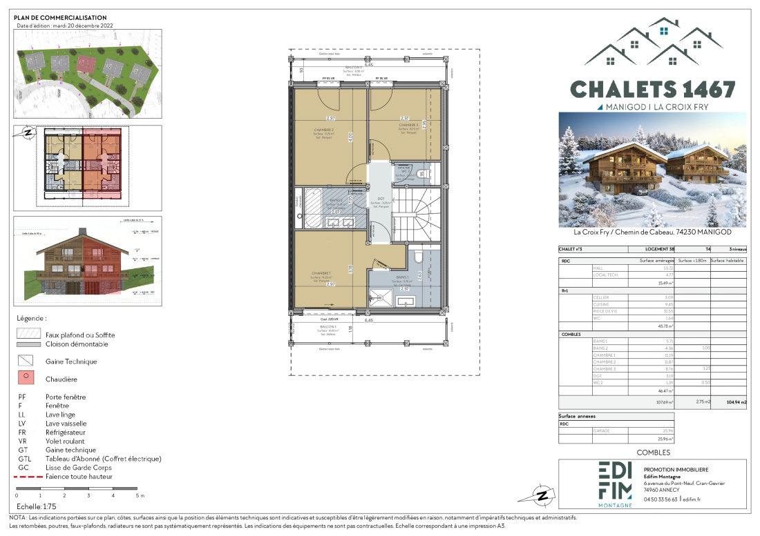 Demi-chalet dans un nouveau programme au col de la Croix-Fry harmonieusement intégrés au paysage et entourés de sapins verdoyants. D'une superficie de 107 m2 plus un garage. Le vaste séjour est agrémenté d’une cheminée, en prévision de longues soirées au coin du feu. Ce chalet profite d’une vue spectaculaire orientée vers les cimes de la Tournette. Toiture à deux pans, mariage de la pierre et du bois, l’architecture s’inspire des maisons traditionnelles de Manigod, constituées d’un volume simple en bois posé dans la pente sur un socle en pierres, et dont le pignon s’ouvre sur le grand paysage.