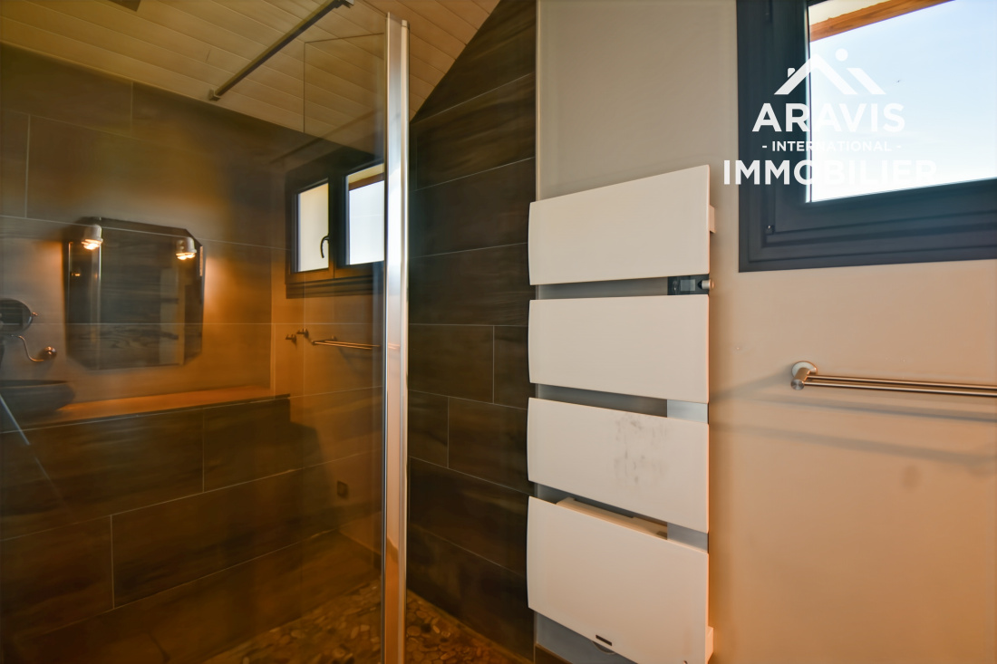 Au rez-de-jardin, une spacieuse pièce de vie, ouverte par une large baie vitrée, donne directement sur la terrasse exposée plein Sud et sa piscine. Depuis cet espace, le panorama est remarquable : lac d’Annecy, Tournette et reliefs environnants s’offrent à vous.