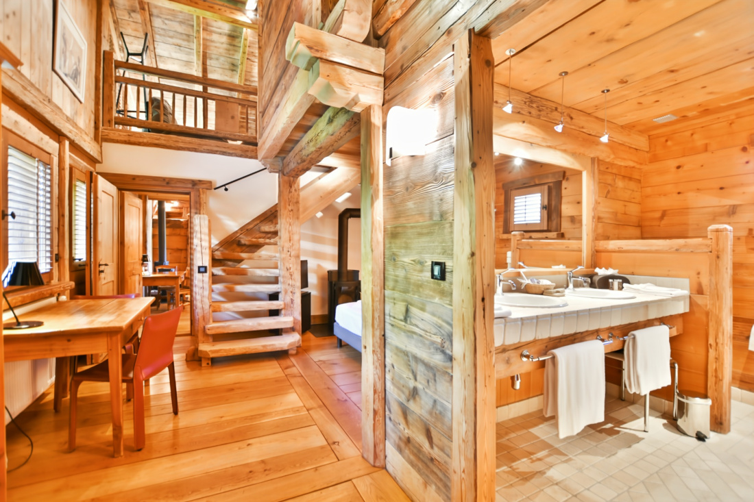 Le chalet se compose actuellement de quatre somptueuses suites, ainsi que d’un studio indépendant en sous-sol comprenant buanderie, chaufferie, casiers à skis et hall d’entrée. Deux escaliers distincts, situés à l’est et à l’ouest, assurent une circulation fluide et harmonieuse entre les différents espaces.